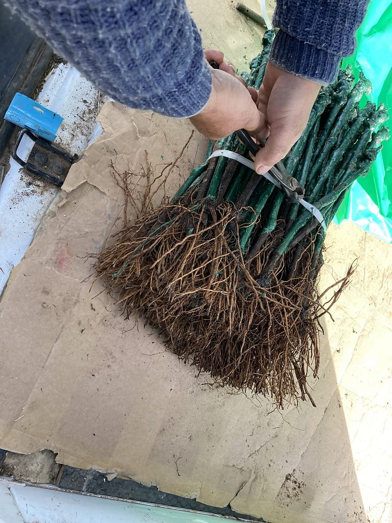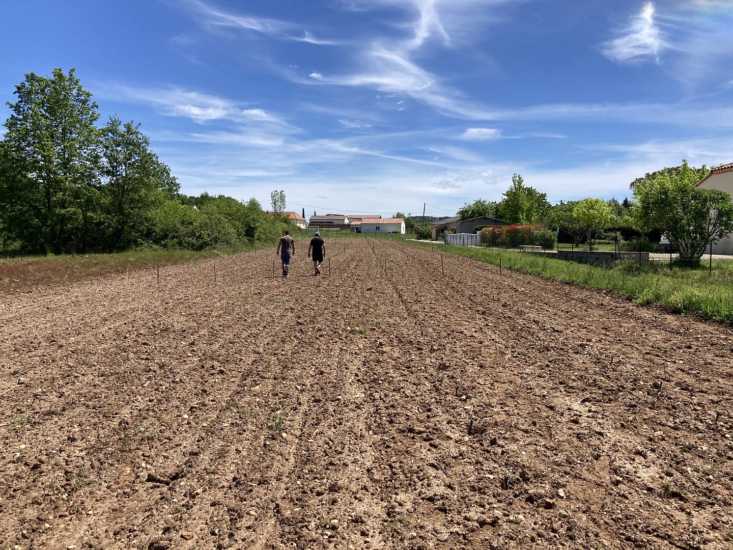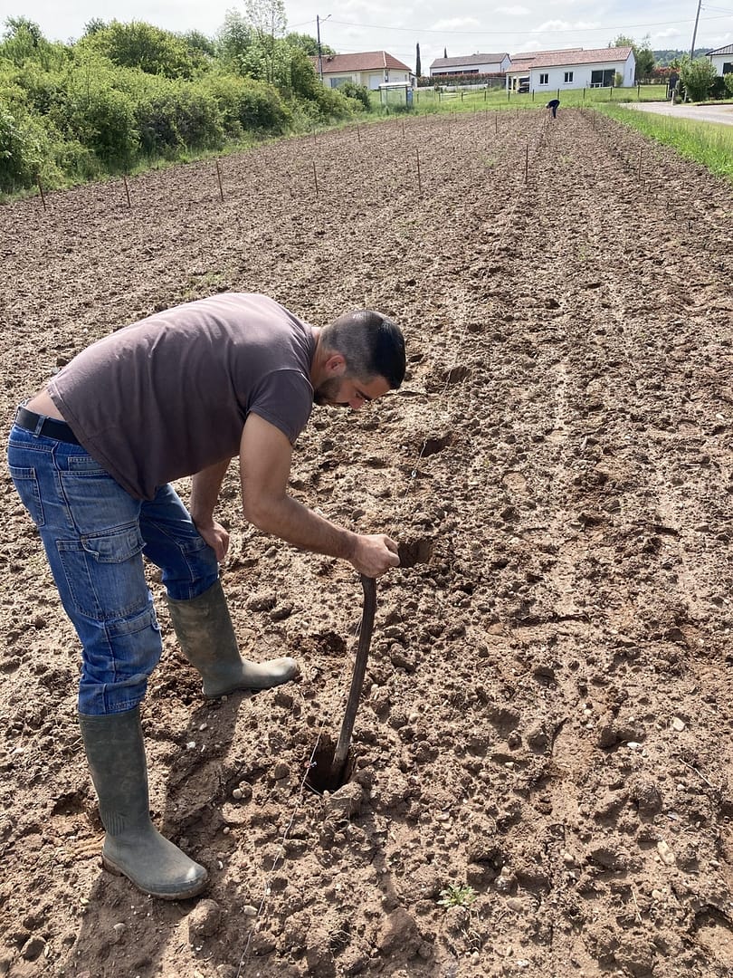 Toute la plantation s’est faite manuellement afin d’apporter un maximum de soin aux plants et pour éviter le tassement des sols. Le travail semble payé puisque 7 jours après nous voyons apparaître les premiers bourgeons. ( voir dernière photo )